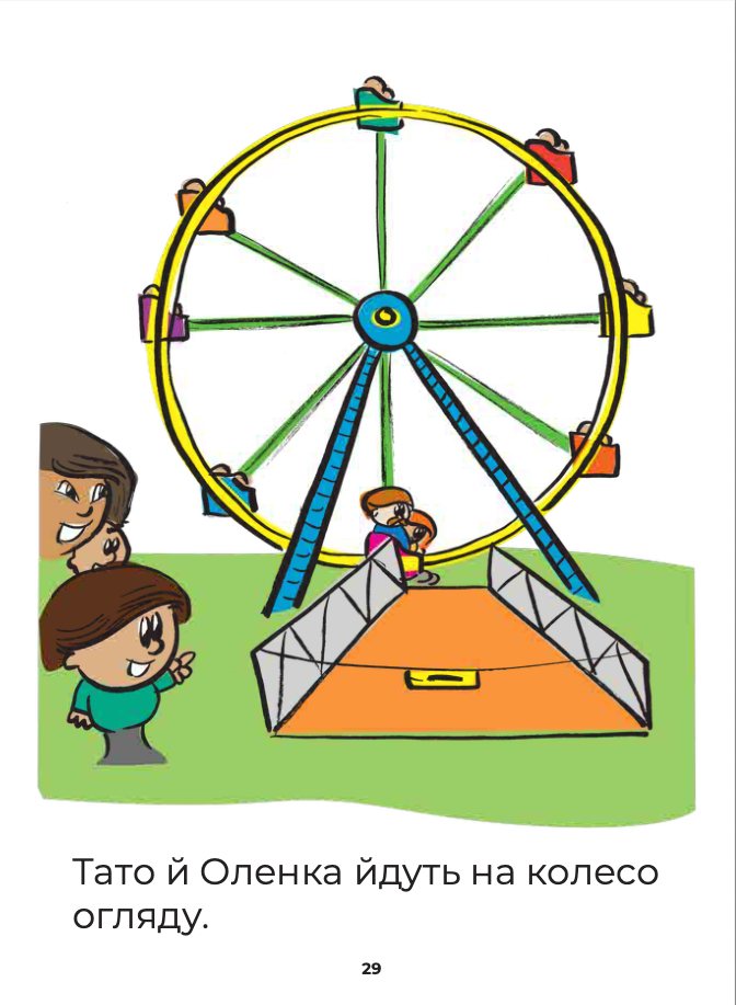 Through short, easy-to-follow sentences and colorful illustrations, children follow Петрик and Оленка as they participate in different activities during vacation.